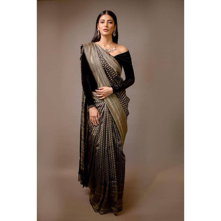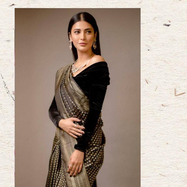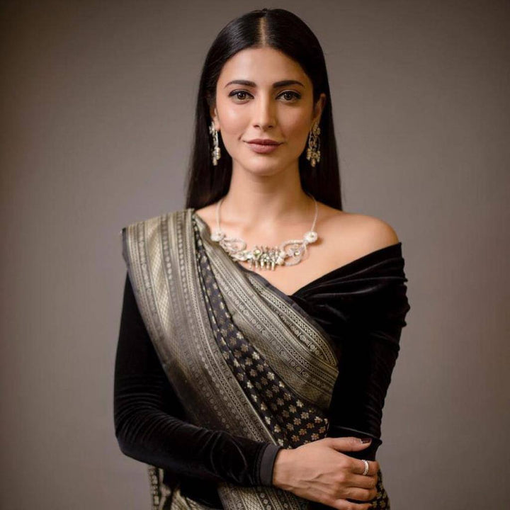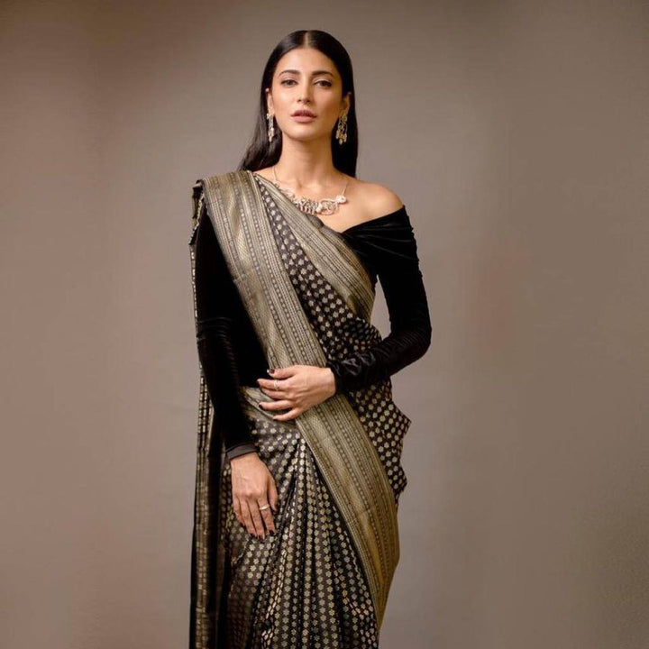 Stylish Black Colour Banarasi Litchi Silk Saree With Blouse Piece