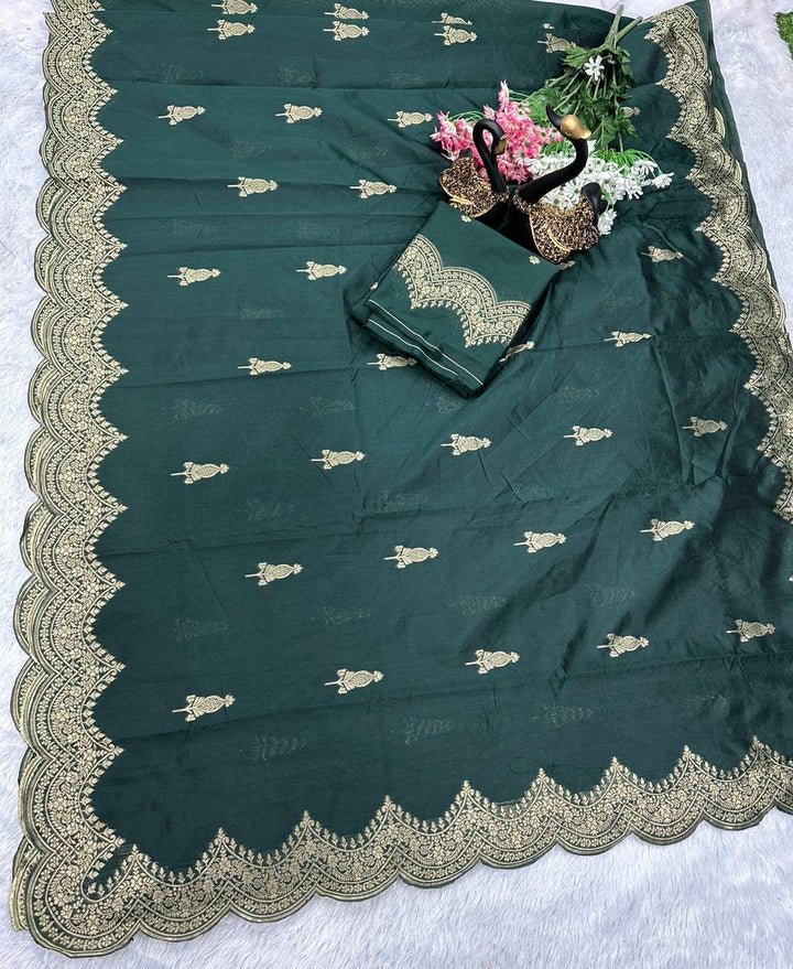 This kanjivaram has body in green colour is adorned with alluring golden zari cycle zooming motifs on body. pallu joined with paithani joint is ornamented with intricate zari works. This drape in exclusive colour combination will be a must have addition to your saree collection.