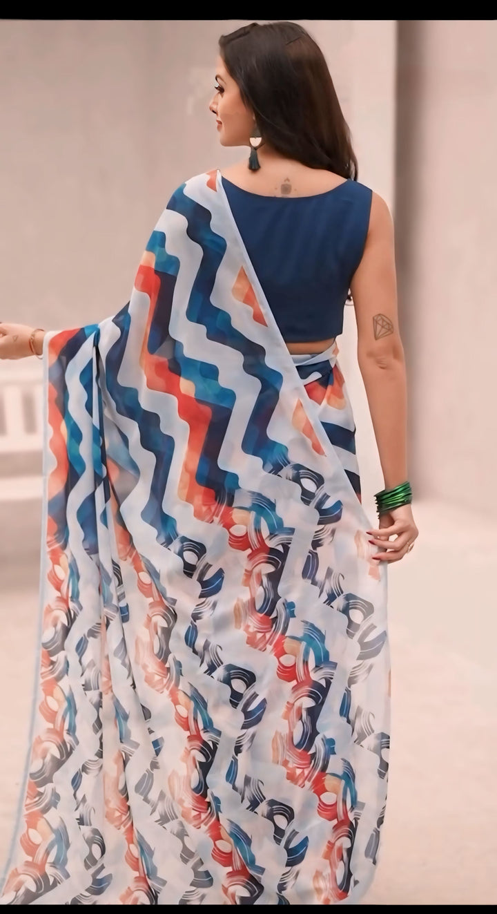 Say goodbye to the hassle of draping a saree with our Impressive 1-Minute Ready To Wear Multicolor Georgette Saree. Simply slip it on and you're ready to go! The vibrant multicolor design adds a pop of color to your outfit, making you stand out from the crowd.