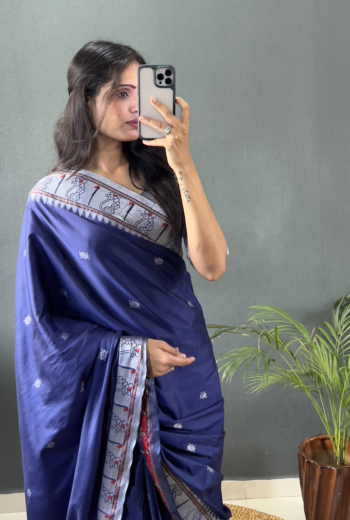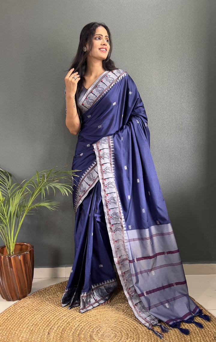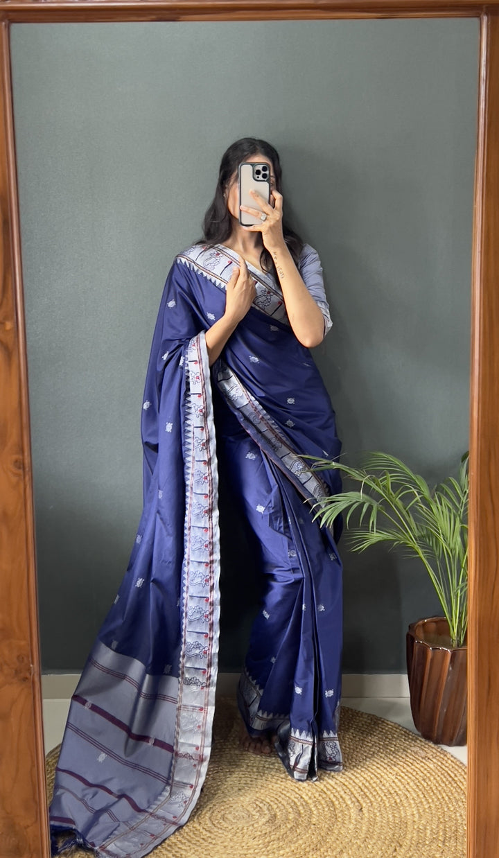 Navy Blue Color Pure Paithani Silk Saree With Muniya Boder And Silver Zari Weaving Work Saree
