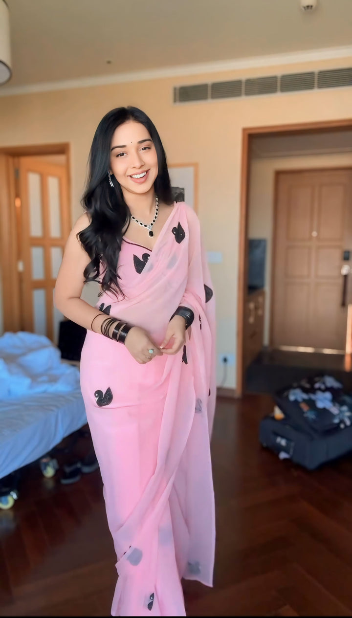 Elevate your elegance with our Ratatouille 1-Minute Ready To Wear Pink Georgette Saree. This exquisite ensemble is adorned with intricate embroidery and sparkling sequence work, giving you a truly luxurious look.