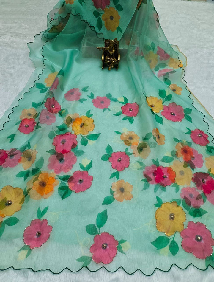 Elevate your ethnic wardrobe with our exquisite Soft Pure Organza Saree, adorned with intricate flower handwork. Crafted from premium quality organza, this saree features a delicate and airy texture that drapes beautifully, offering both comfort and elegance.