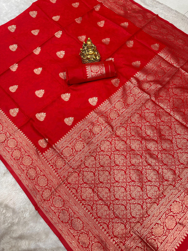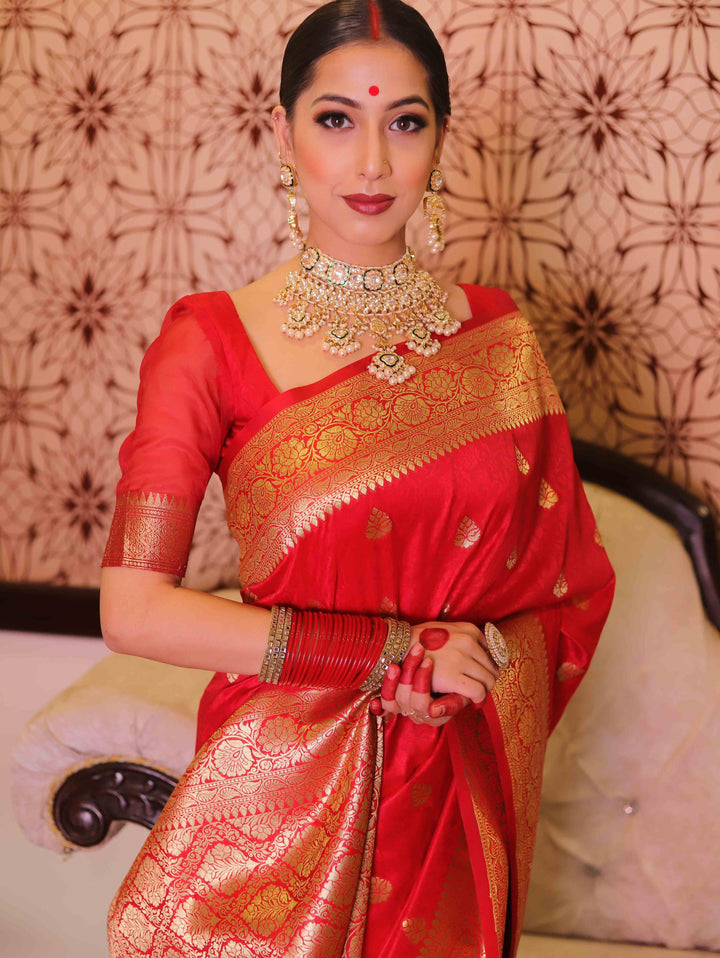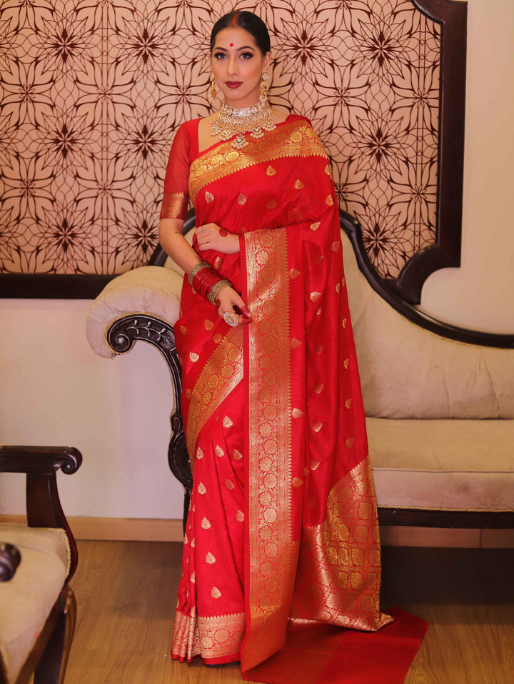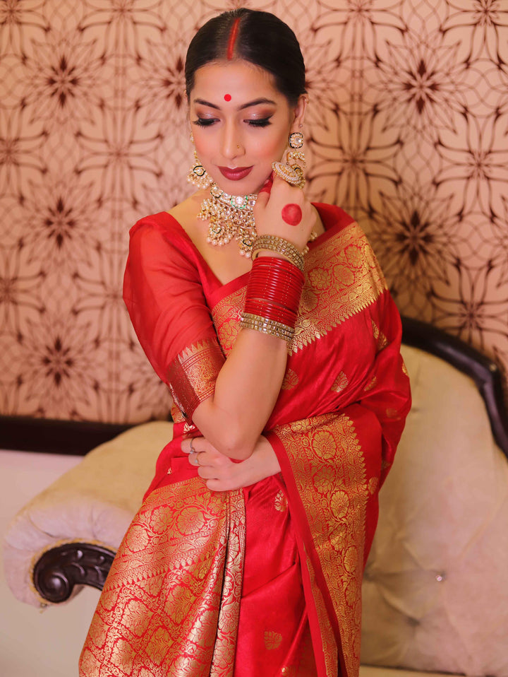 Expertly crafted with a rich red hue, the Kanchivaram Bridal Saree exudes elegance and sophistication. Made with high-quality fabric, this saree drapes beautifully and is sure to make a statement. Perfect for formal events or special occasions, this saree is a must-have in any wardrobe.